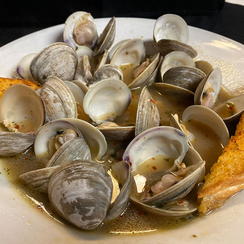 Local Clams, Steamed in Beer, Garlic Red Pepper Flakes, Onion Served with Our Homemade Garlic Bread